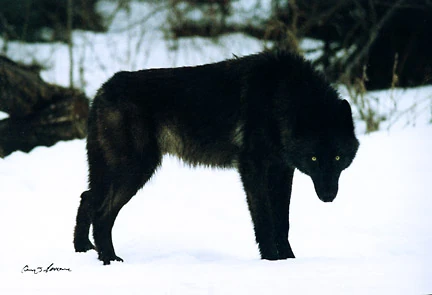 CECHY SZCZEGÓLNE: Wilk ten jest większy niż inni przedstawiciele jego gatunku. Ma również lśniące złotem oczy i kilka jaśniejszych plam na brzuchu.